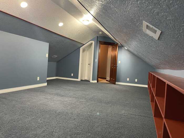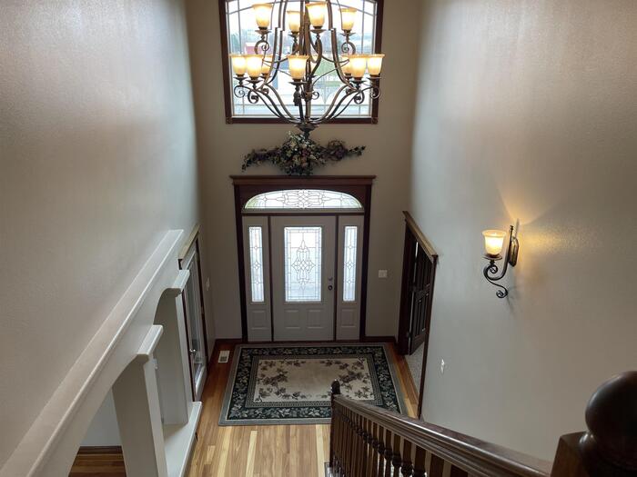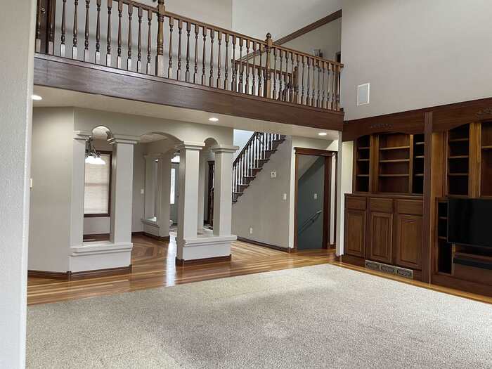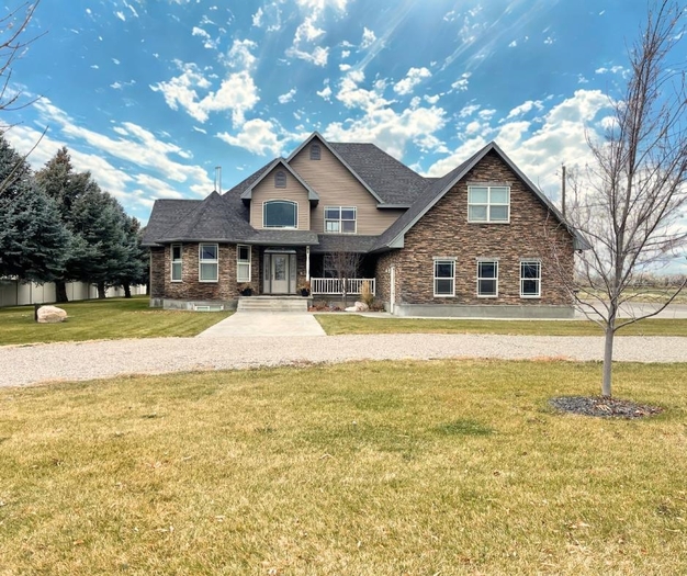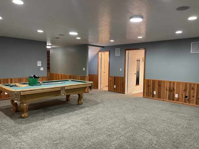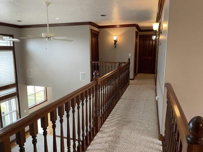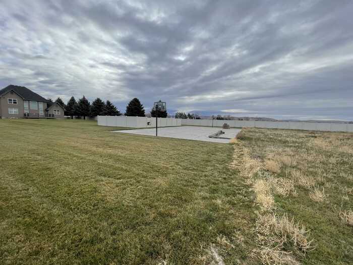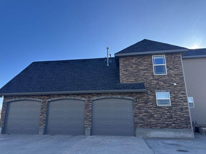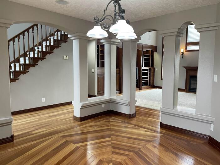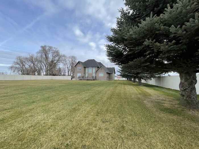Stunning custom-designed home loaded with upgrades and thoughtful details throughout! The main level features lyptus wood flooring, a versatile living room/office, and a spacious family room with 17-ft ceilings, custom built-ins, gas fireplace, and open catwalk. A half bath leads to the beautiful primary suite with coved tray ceiling, new bath with double sinks, granite counters, soaker tub, walk-in shower, and two walk-in closets with custom shelving. The kitchen includes custom cabinets, stainless appliances, new built-in range, wall oven, microwave, and built-in china hutch. Access the new Trex deck from the kitchen or primary suite and enjoy the huge backyard with a cemented basketball court and space for a future shop. Main-level laundry offers a folding counter, sink, cabinetry, ironing board, and laundry chute. Upstairs features 4 bedrooms, 2 baths, and a bonus room over the 3-car garage. The fully finished basement includes 2 bedrooms, a bath, 3 storage rooms, large great room with pool table, kitchenette/bar, built-in desk, exercise room. Major mechanicals: 2 furnaces, 2 gas water heaters, AC, and whole-house intercom. The insulated, sheet-rocked garage has newer doors. Truly a must-see! Buyer to verify sq ft.