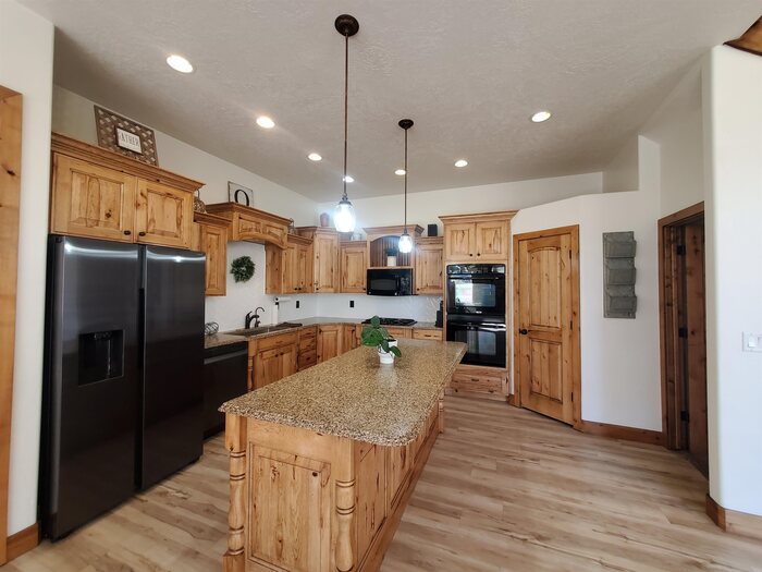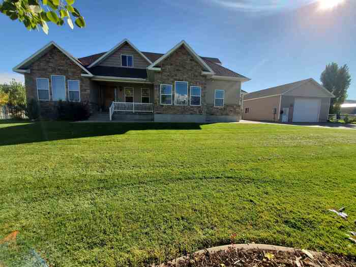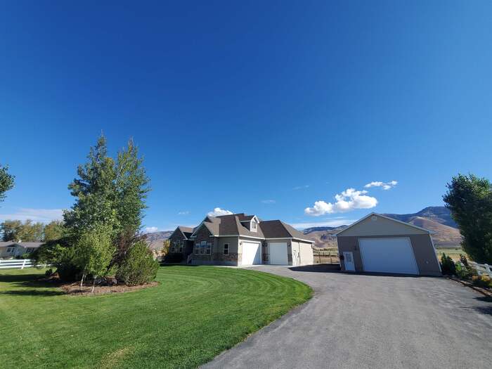 PRICE REDUCTION!!! Exquisite Country Estate with Mountain Views in Bennington, Idaho! Welcome to this stunning 6-bedroom, 3.5-bathroom country estate nestled on 1.33 meticulously landscaped acres in the serene setting of Bennington, Idaho. Boasting 4,300 sq ft of luxurious living space, this custom home offers panoramic mountain views, breathtaking sunsets, and the peaceful charm of rural life-while still being minutes from outdoor recreation. Step inside to a beautifully designed interior featuring 9ft solid alder doors and cabinetry, granite countertops, tiled kitchen backsplash, and top-of-the-line new appliances in an open concept layout perfect for entertaining. Soaring vaulted ceilings highlight the living room, where a stunning chandelier and floor to ceiling windows frame the picturesque views. A gas fireplace in the living room and a wood-burning stove in the expansive dining area offer cozy ambiance year-round. The spacious primary suite offers a private retreat with a walk in closet, separate jetted tub and walk-in shower, and a private water closet. The fininshed basement includes a wet bar, generous storage, and a built-in gun safe discreetly located in the secure basement storage room. Two endless hot water heaters ensure whole house comfort. Outside, enjoy the beauty of Idaho's countryside with a large back deck perfect for wildlife viewing, a patio with pergola, and a charming front patio ideal for seasonal decorating. The fully fenced backyard opens to pasture views, mature trees, and lush landscaping. In addition to the attached three-car garage, the property includes two shops-one 20x30 and another 30x50 fully insulated and heated with 12' walls-plus a dedicated woodshed, offering ample space for hobbies, equipment, or storage. This rare offering is a must-see for buyers seeking luxury, space, and tranquility. Located within miles of some of Idaho's best outdoor activities-hiking, fishing, hunting, beautiful Bear Lake and more-this home is where comfort meets adventure. Square footage figures are provided as a courtesy estimate only and were obtained from Bear Lake County. Buyer is advised to obtain an independent measurement.