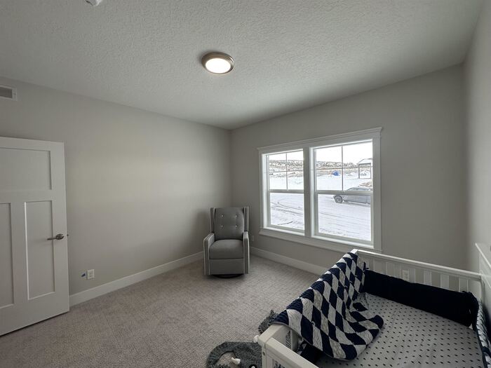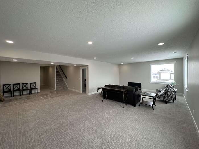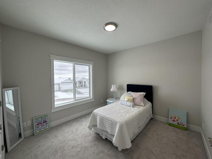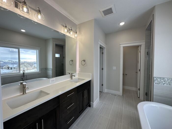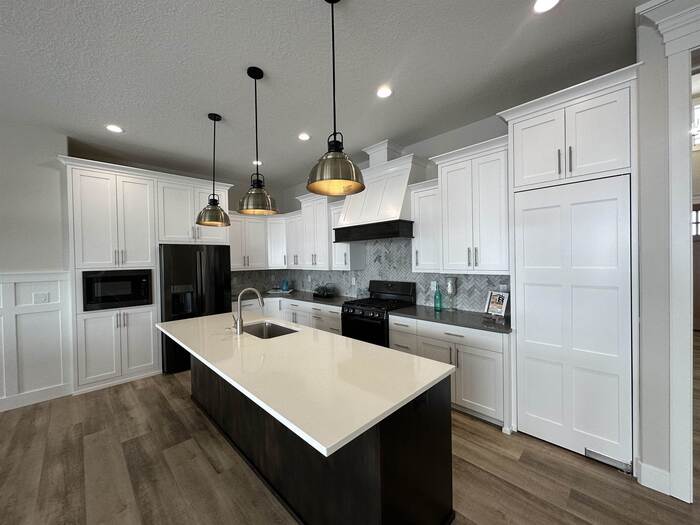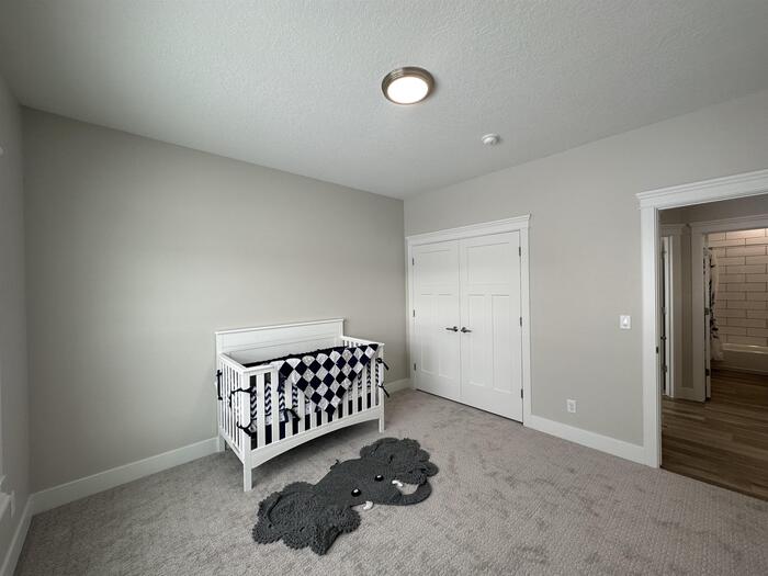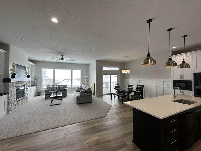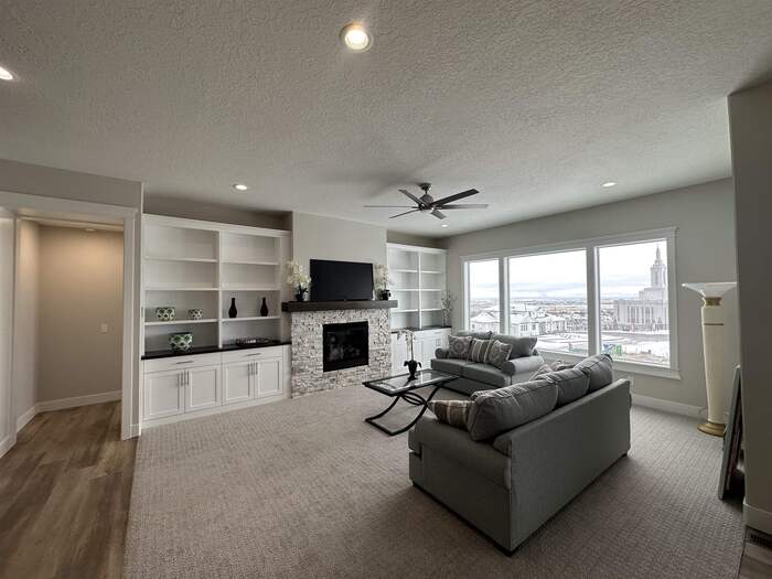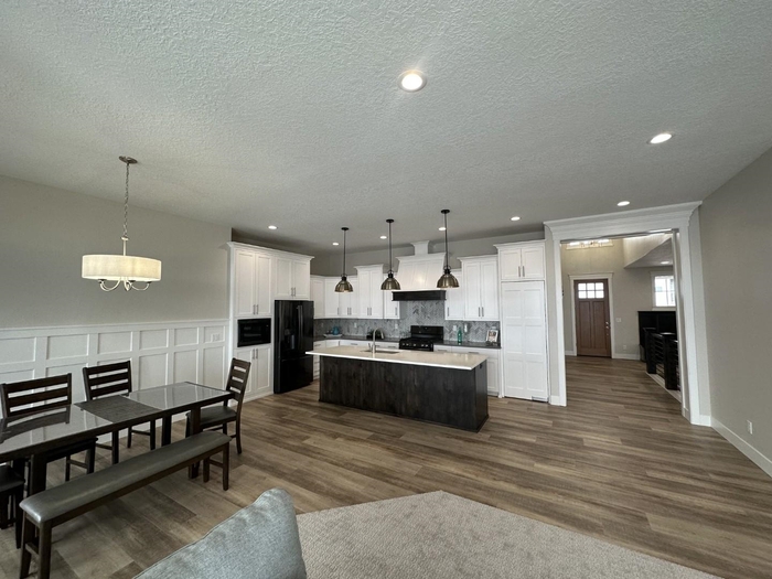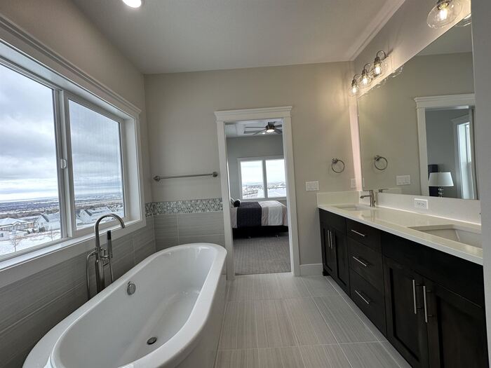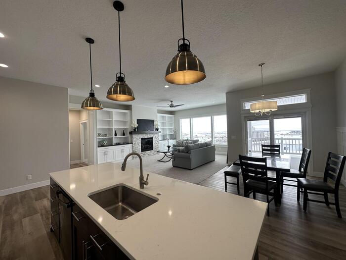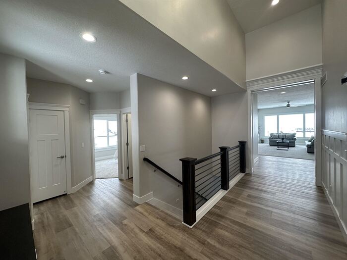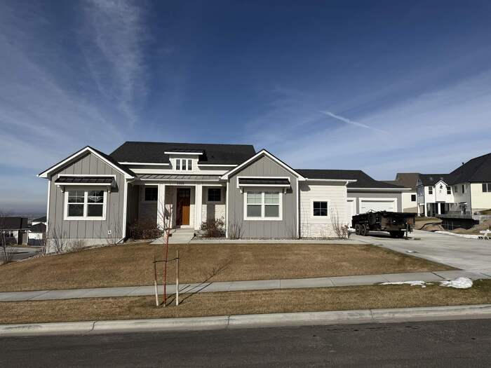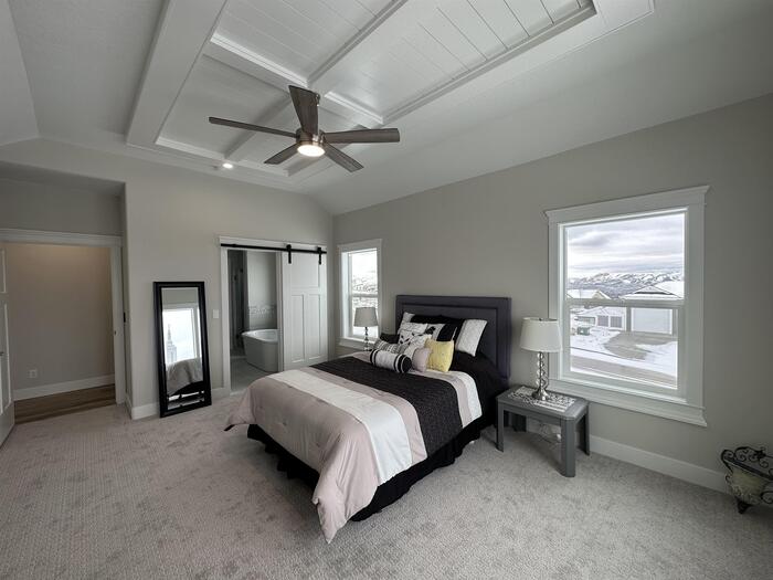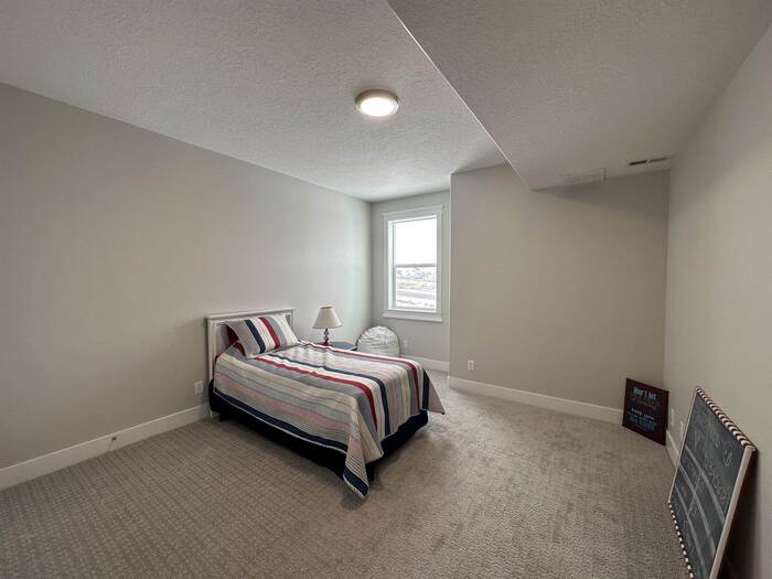 This stunning home was recently used as our model and is now available for purchase. The thoughtfully designed main floor offers 3 spacious bedrooms and 2 full bathrooms, complemented by durable LVP flooring. The kitchen features a large island, a hidden walk-in pantry, and quartz countertops that continue throughout the home. Soaring ceilings highlight the entryway with 15-foot heights, while the main living areas offer 10-foot ceilings and the basement features 9-foot ceilings. The finished portion of the basement includes a family room, bedroom, and bathroom, with space to add two additional bedrooms at an additional cost. Completing the home is an oversized, fully finished and heated 4-car garage with a finished office space with built in desk, perfect for storage and workspace needs. Fully landscaped yard and VIEWS VIEWS VIEWS.
