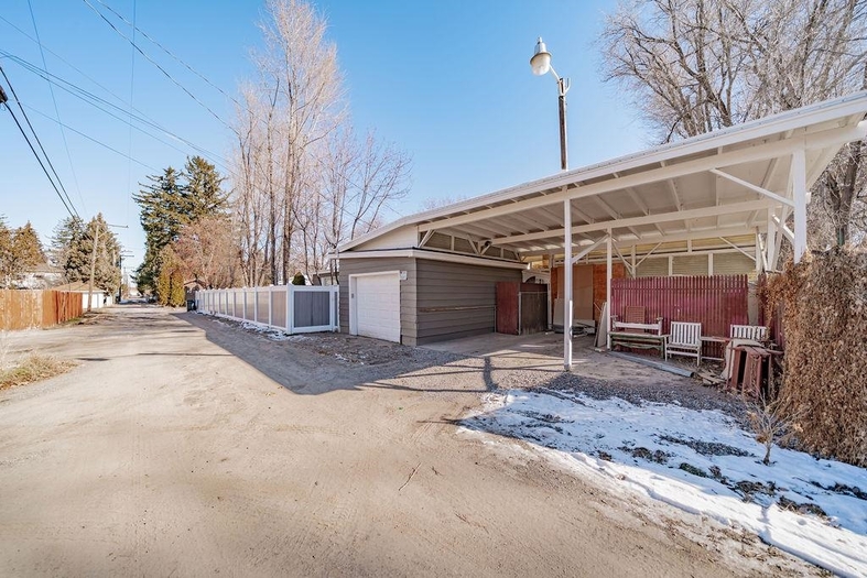 Darling one-level home on a quiet street on the east side! The front porch welcomes you into this home with spacious living room, dining and kitchen. There are 3 bedrooms, one very large one on the south, a small bedroom in the middle and a nice sized bedroom on the north w/a private 1/2 bathroom. On the back (north) of the house is a large step down family room with access to the private back yard and the single attached garage. Not attached is the double carport off the alley. The back yard also has a cosy firepit area, but the fire ring itself will not stay. The gas furnace is updated with central AC added. The vinyl privacy fence is very nicely done. along the alley. Much of the house has updated paint and flooring. There is a dog run on one side of the carport, but could be removed for the 2nd parking space. Hot Tub is up and running. There is a storage closet (being used as a craft room) off of the family room.