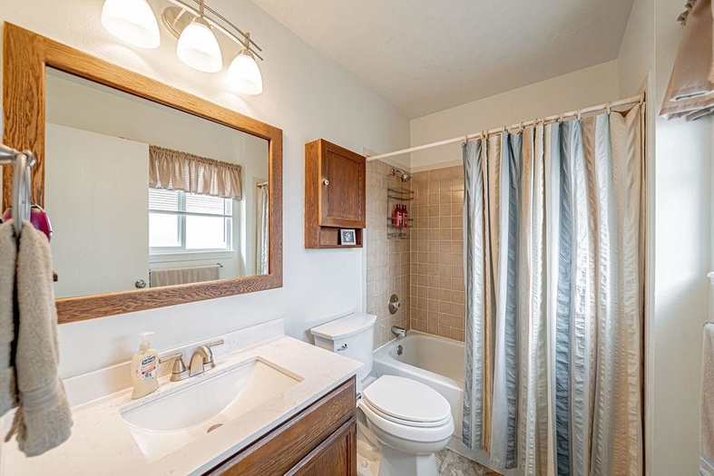 This wonderfully maintained multi-level home offers a fantastic blend of comfort and abundant space. Step inside to a bright main level featuring a living room, with ample space, anchored by a large bay window. The dining area flows seamlessly into an updated kitchen showcasing stunning granite countertops, rich dark cabinetry, a breakfast bar, and crisp white appliances. The open layout overlooks the lower level, keeping you connected with guests. There, you will discover a large family room detailed with plush carpeting and a sliding glass door providing direct access to the backyard. Step outside to enjoy an expansive, fully fenced backyard that acts as a private outdoor oasis. It boasts a covered patio, a roomy shed, a manicured lawn, and a separately fenced garden space ready for your green thumb. On the top floor, you will find a comfortable primary bedroom featuring generous closet space, while the bright ensuite bathroom offers a wood vanity. There are two additional bedrooms that feature closets with built-in organizers. On the lowest level, you will find a fourth bedroom and full bath, great for guests. You will absolutely love the incredible storage room equipped with extensive built-in shelving, perfect for keeping everything organized. Just a quick walk will take you to your pick of parks and Chubbuck Elementary School. Don't miss the opportunity to own this sweet home.