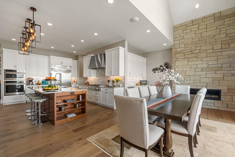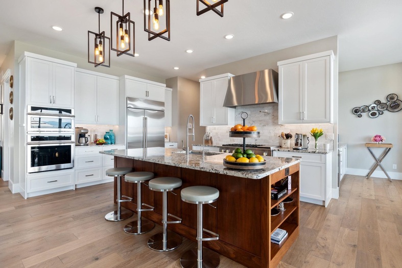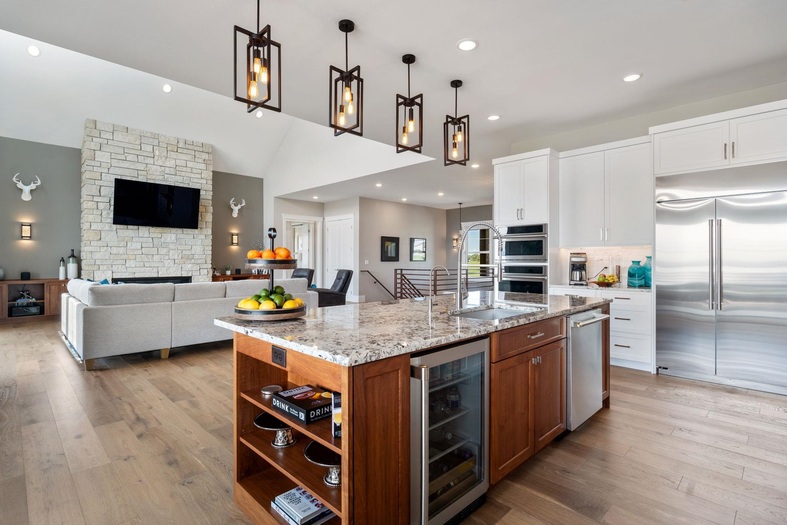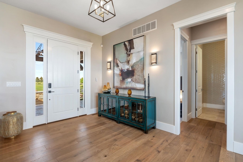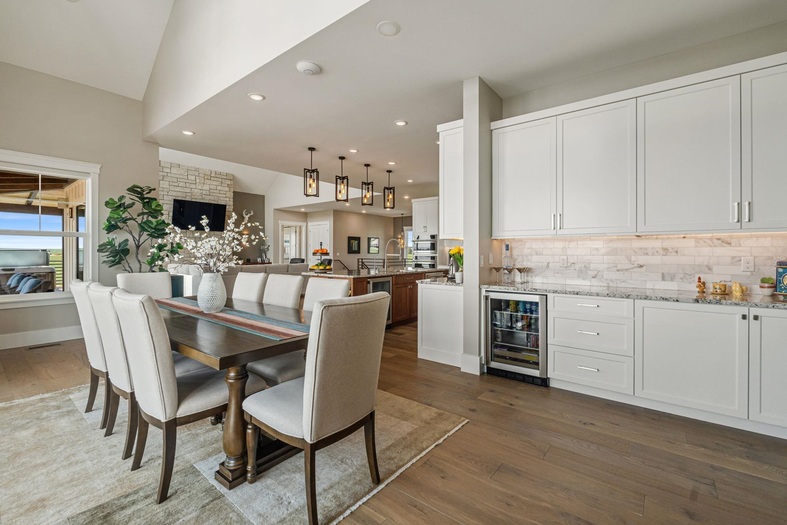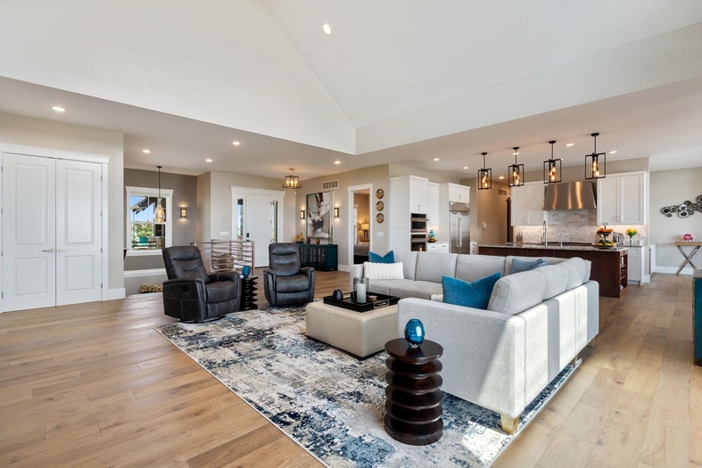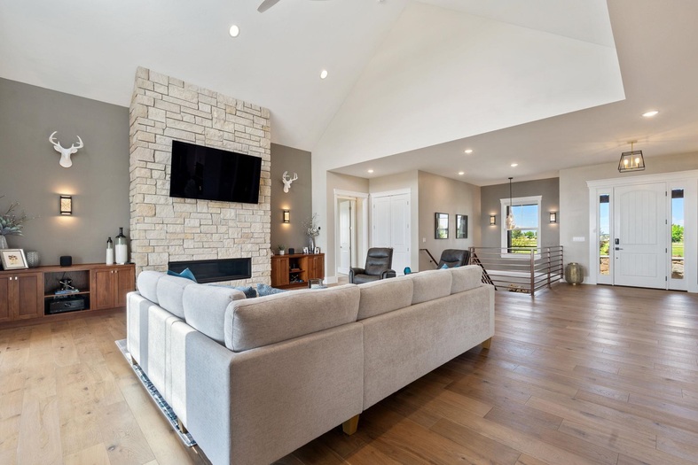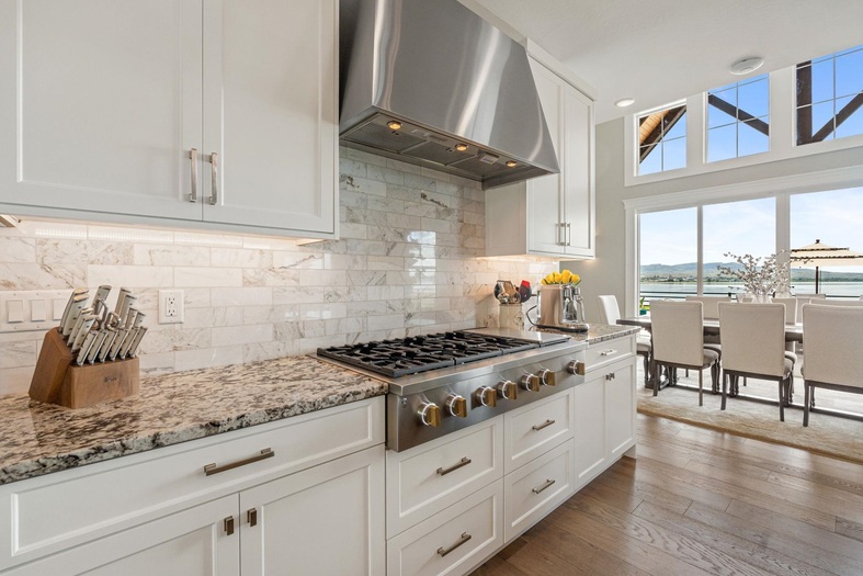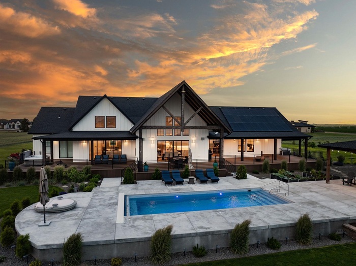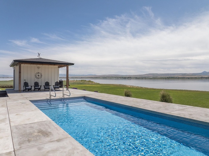 Lakeside luxury meets self sustaining lifestyle! Enjoy luxury independence with this custom waterfront estate in Waters Edge: American Falls exclusive gated community. Designed to impress, this home showcases expansive living spaces: dramatic 22' vaulted ceilings, two 14' stone fireplaces, & 10' ceilings throughout with windows & glass sliders that frame truly breathtaking, panoramic water & mountain views. Expansive living spaces flow effortlessly, offering the perfect balance of openness and comfort. Three main-level ensuites provide ample privacy for rest and relaxation as designer finishes elevate each room. Premium Monogram appliances & dual Lennox HVAC systems exude high efficiency year-round performance. The spacious lower level is an entertainer's dream, featuring a wet bar, a home gym, crafting room & abundant storage. Two sizable bedrooms and bathroom offer everyday functionality without compromise. Outdoors, indulge in a private resort-style & homestead-to-table setting. An expansive 2800 sqft wraparound deck leads to a stunning saltwater pool, complete with a Bullfrog spa, set against unobstructed lake views. Meticulously manicured grounds showcase flower beds, tranquil water features, a mature orchard, & raised vegetable gardens. This is more than a home; it's a statement of refined living offering immediate access to fishing, boating & scenic lakeside hiking.